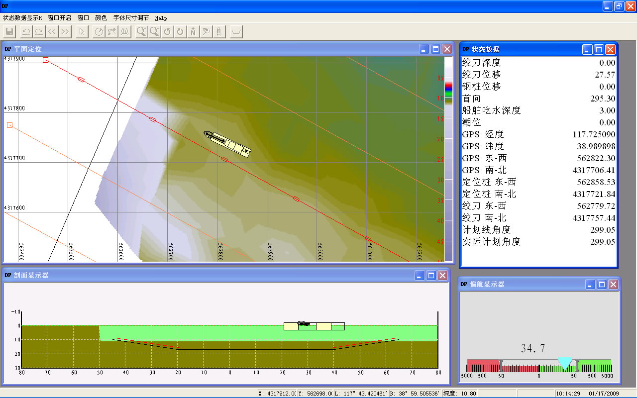 Through RS-485 or RS-422, RS-232 communication interface, read the information of ship's bearing, heading, draft, rake arm or reamer position from DGPS, electric compass, depth sounder, AIS, dredging integrated control system and other peripheral equipment, and display it vividly on the computer screen in real time through visual graphics.